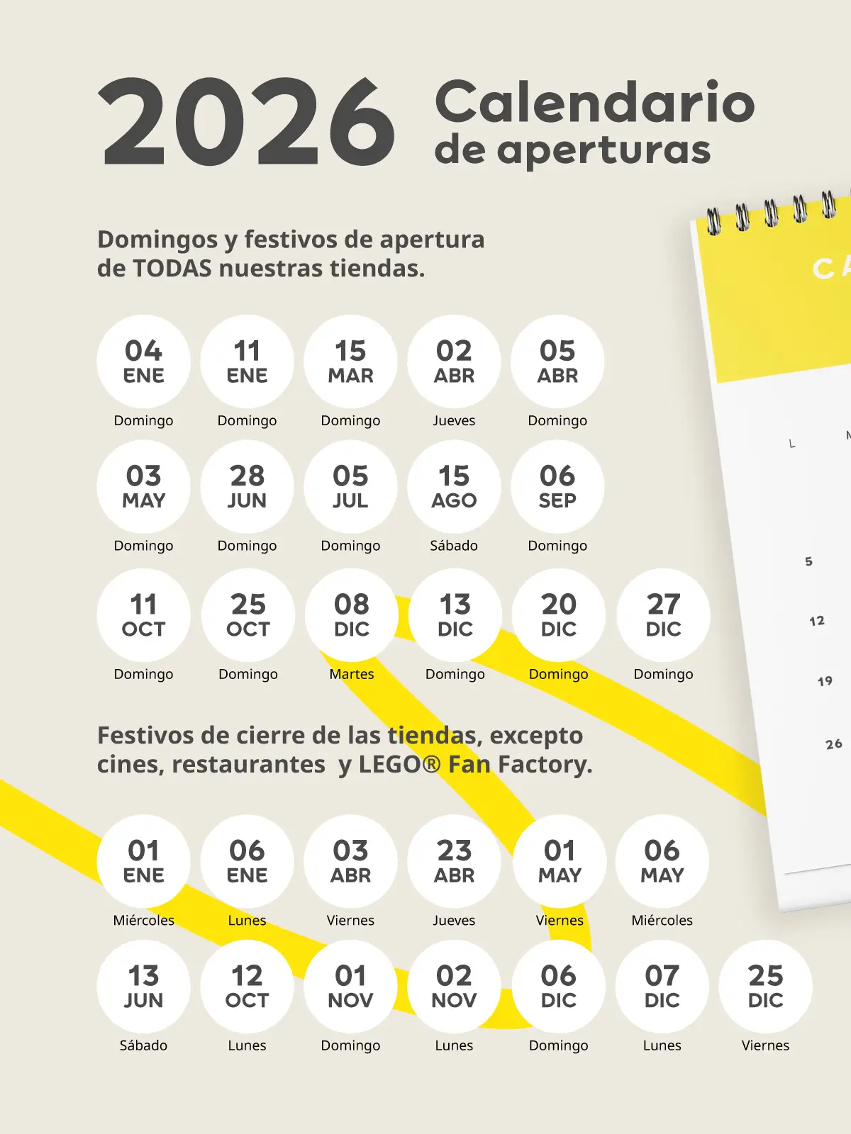 Los días de cierre del Centro Comercial, los restaurantes, cines y LEGO® Fan Factory abren en su horario correspondiente*: