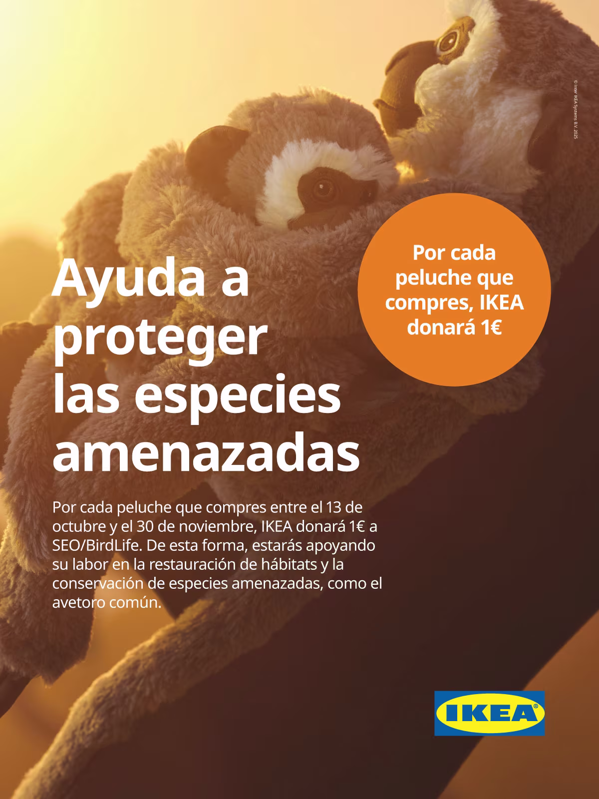 Por eso, del 13 de octubre al 30 de noviembre, en IKEA Valladolid (RÍO Shopping), cada vez que compres un peluche estarás colaborando con la conservación de la fauna: IKEA dona 1 € a SEO/BirdLife por cada peluche vendido.