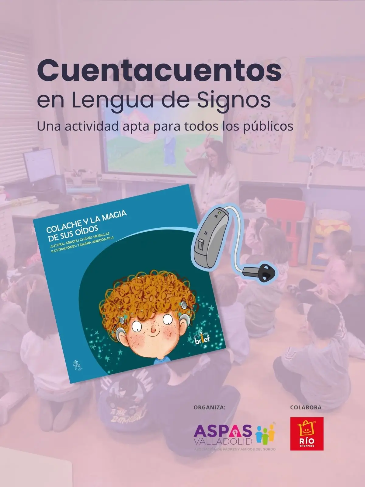 La actividad está pensada para todos los públicos y especialmente para sensibilizar y compartir con las familias. Durante el cuentacuentos, se presentará el libro “Colache y la magia de sus oídos”, que narra la historia de un niño con implante coclear. La lectura se realizará de manera oral y en lengua de signos, para que todos los niños y niñas puedan disfrutarla por igual.